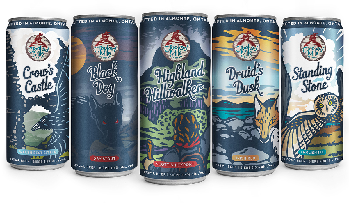 Crooked Mile Brewing Company Craft Beer Labels: Art direction, design, and illustration for a microbrewery in Almonte, Ontario. Crooked Mile commissioned me to create illustrations for each of their flagship beers based on vistas the owners fell in love with during a walking tour in the UK.