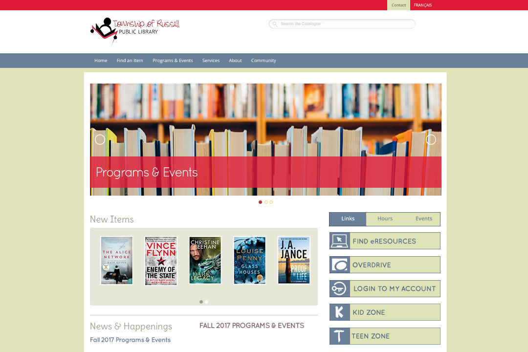 The Township of Russell Public Library: The lion’s share of our websites are built on the Wordpress.com platform, with the occasional .org site and the even more occasional custom build. The Township of Russell Public Library hired us to develop a robust site on the Wordpress.org platform, and we were all very satisfied with the final product: convenient, effective, powerful, and lovely to look at! To see the full site please go to http://www.russellbiblio.com.