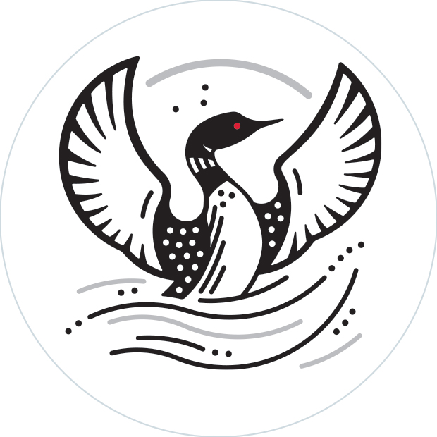 The loon’s upward gaze reinforces the theme of rising and renewal, while the circular background element subtly suggests the sun breaking over the water, tying into the brand’s connection to nature. Designed in black and white with a striking red eye, the logo maintains strong visual impact while staying true to the client’s vision of a bold, refined representation of the loon.
