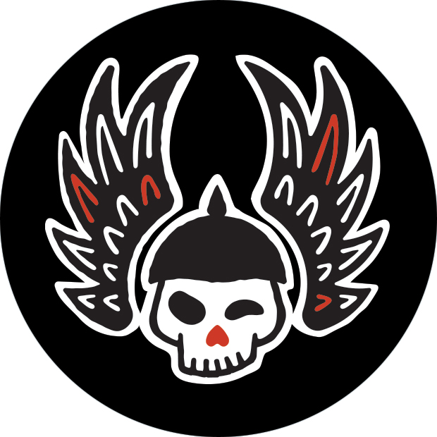 The design features a winking winged skull with a devious smile, reinforcing the playful yet edgy tone of the brand. The nose is shaped as an upside-down heart, subtly nodding to the brand’s themes of artistry and connection. The bold black, white, and red colour palette enhances the logo’s striking presence, while the stylized wings add a sense of movement and rebellious energy.
