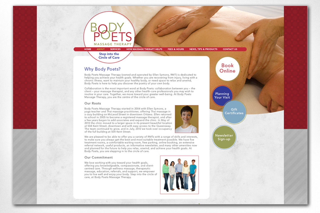 Body Poets Massage Therapy – Inside Page: All the inside pages for the Body Poets site are designed for maximum legibility with a view towards conveying a large amount of information in the most clear and concise way possible. Simple navigational buttons echoing those on the landing page sit off to the side to make finding content easy. To see the full site please go to http://www.bodypoets.com.