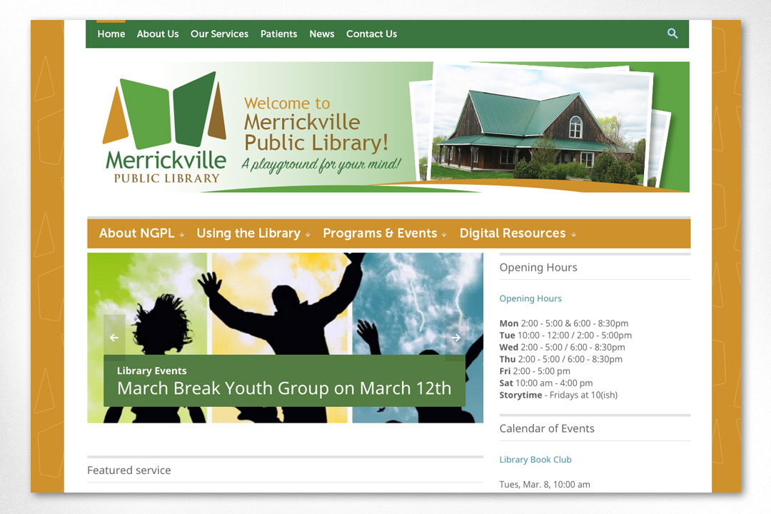 The Merrickville Public Library came to us because they knew that they needed a new site in order to better organize their content and to be mobile-friendly. There were elements about their old site that they really liked, including a more structured look and feel and not a ton of white space, so a Wordpress template was selected that answered to all these wants and needs, styled to be consistent with their new branding, also designed by Sumack Loft. To see the full site please go to http://www.merrickvillelibrary.ca.