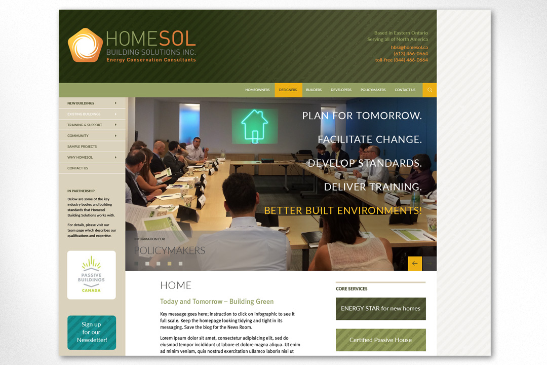 Homesol Building Solutions: This website, built for a local energy consultancy, is a good example of a highly customized site that is still based on a purchased Wordpress theme. It’s a great way to conserve budget while still achieving a highly individualized visual experience, with customized graphics and buttons, and a specialized colour palette. Logo was also designed at Sumack Loft. To see the full site please go to http://www.homesol.ca.
