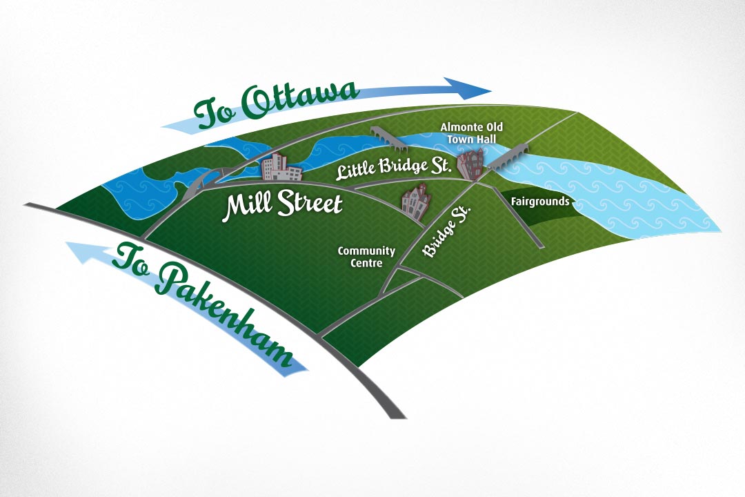 Map of Almonte: The Town of Mississippi Mills (Almonte) commissioned an illustrated map of downtown Almonte for their Mainstreet Almonte Attraction and Promotion (MAAP) initiative. Client requested stylized illustrations of notable local architecture. An engaging, lively map illustration was developed with a fresh, cool colour palette and agreeable textures and typography.