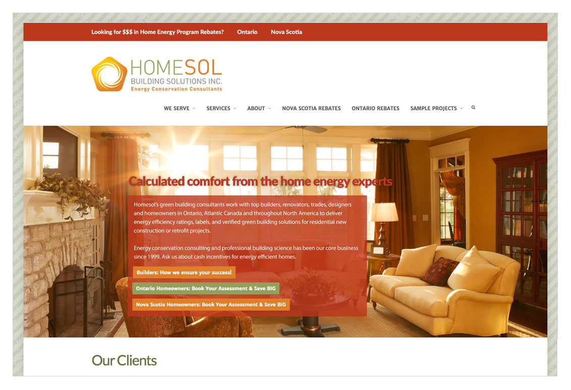 Homesol Building Solutions: This website, built for a local energy consultancy, is a good example of a highly customized site that is still based on a purchased Wordpress theme. It’s a great way to conserve budget while still achieving a highly individualized visual experience, with customized graphics and buttons, and a specialized colour palette. Logo was also designed at Sumack Loft. To see the full site please go to http://www.homesol.ca.